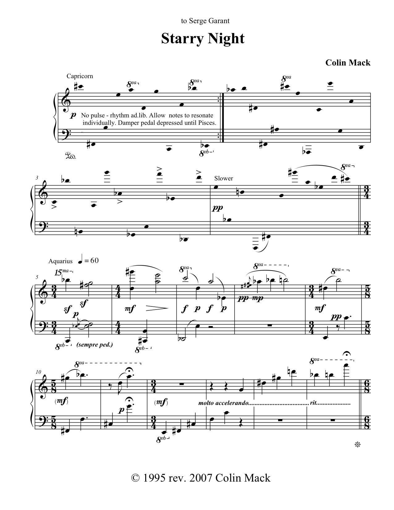 The first page of Mack’s piano composition “Starry Night,” completed in 1995 and dedicated to Serge Garant