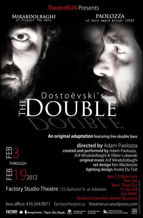 The Double, directed by Adam Paolozza and featuring Paolozza, Arif Mirabdolbaghi and Viktor Lukawski, previews Oct. 15-22 and runs Oct. 23-Nov. 15 at the Tarragon Theatre in Toronto. For more information about Adam Paolozza, please visit TheatreRUN.