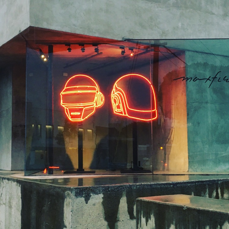 Neon helmet signs created by Lisa Schulte and her company Nights of Neon for a Daft Punk pop-up store at Maxfield’s in February 2017 (photo courtesy of Lisa Schulte)