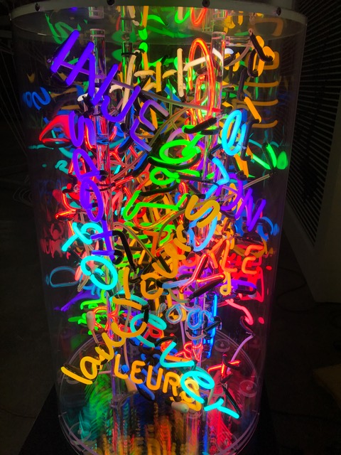 I just started grabbing the neon I have in my studio from my company – 30 or 40 words that were already made – and shoving them on to a pedestal, upside down, backwards, vertical, horizontal. I made the sculpture and I was like, “Let’s encase that in plexiglass.”