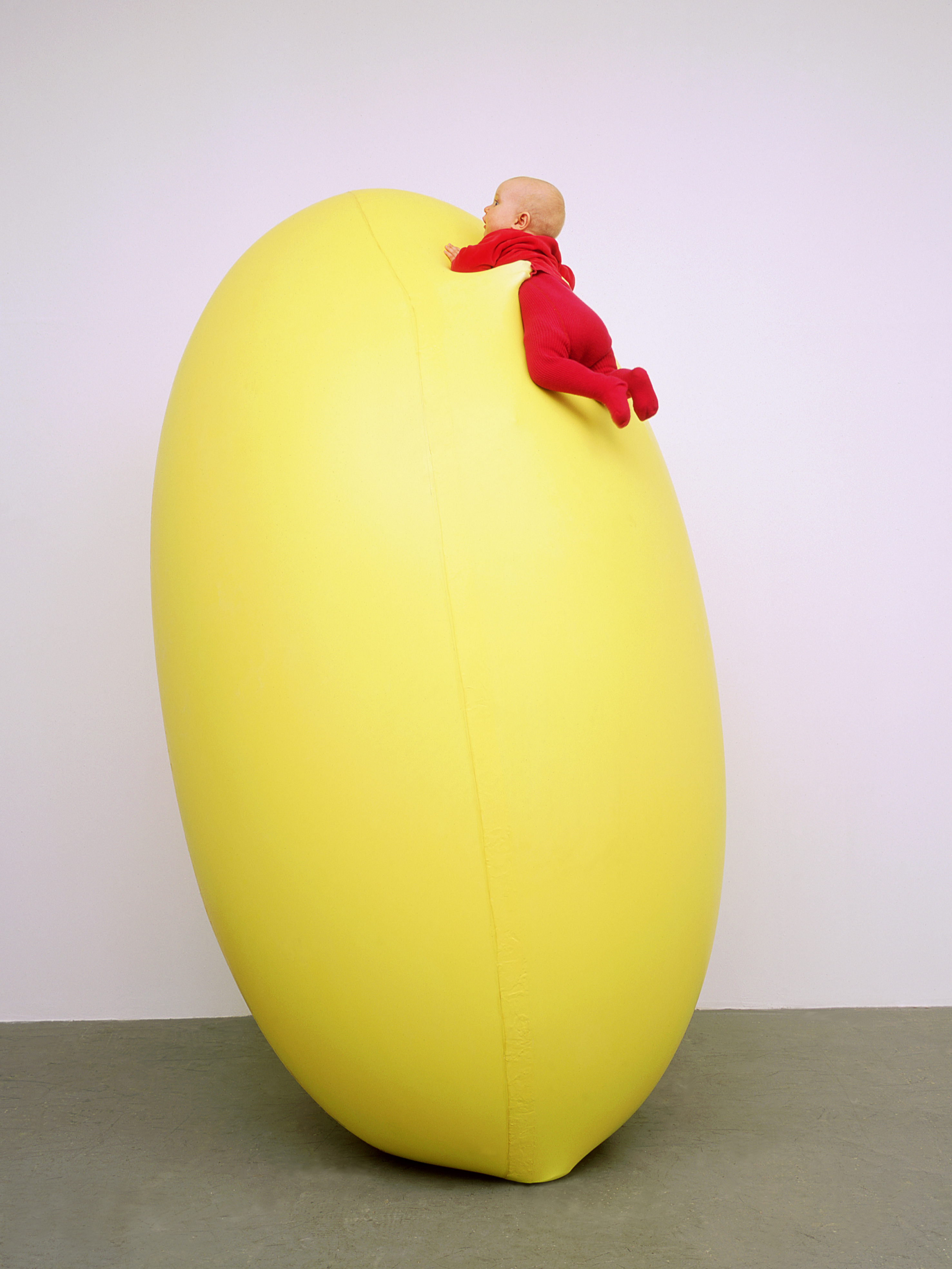 “o.T. – Yellow sculpture fitting to Julie” (1998), balloon/air/ artist/Julie; Cibachrome, 100 x 75 cm, © Hans Hemmert and VG Bild Kunst