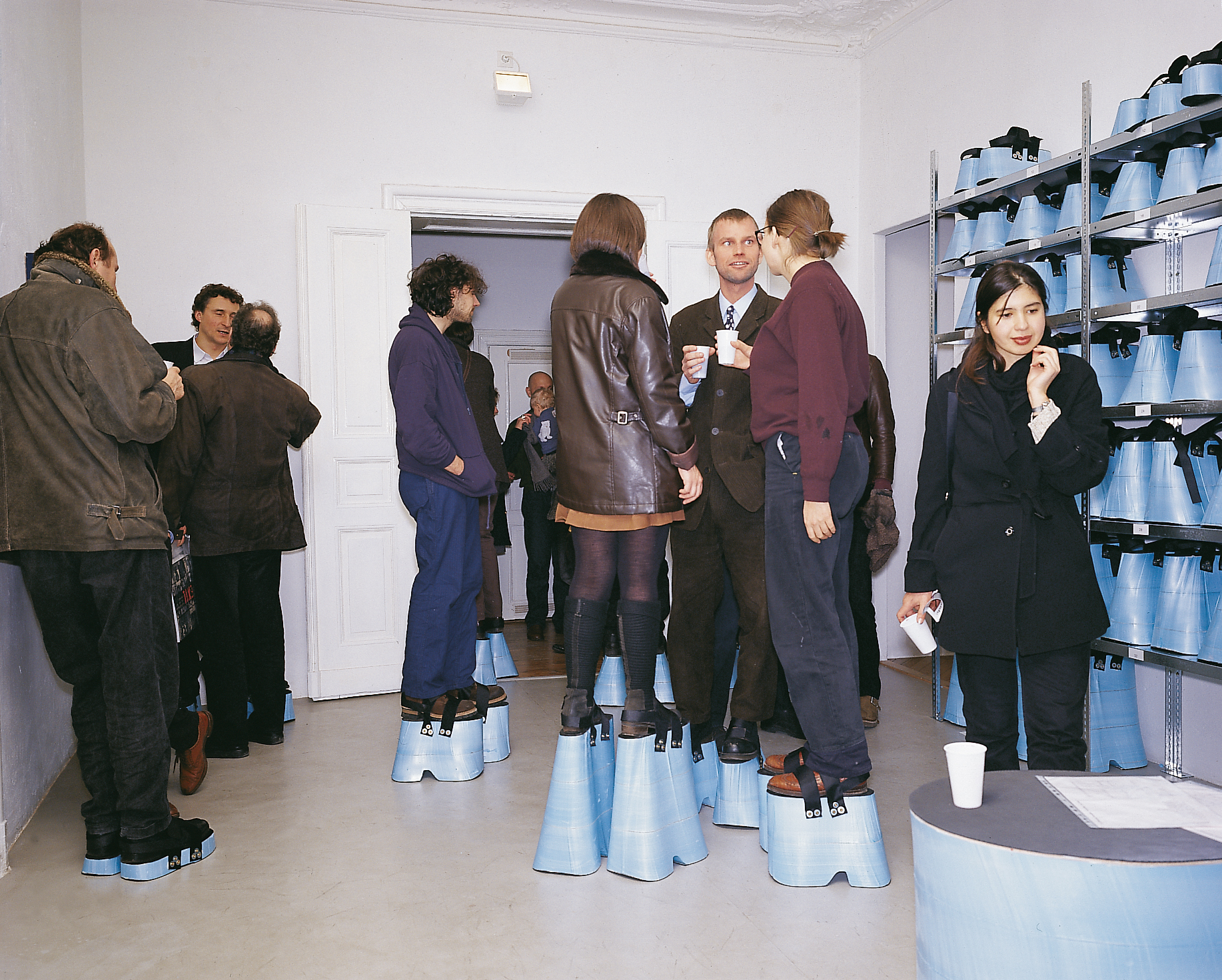 “level” (1997), Styrodur/rubber/Velcro/measuring device, 50 pairs of platform shoes with heights of 5-43 cm, installation view at Galerie Gebauer Berlin, © Hans Hemmert and VG Bild Kunst