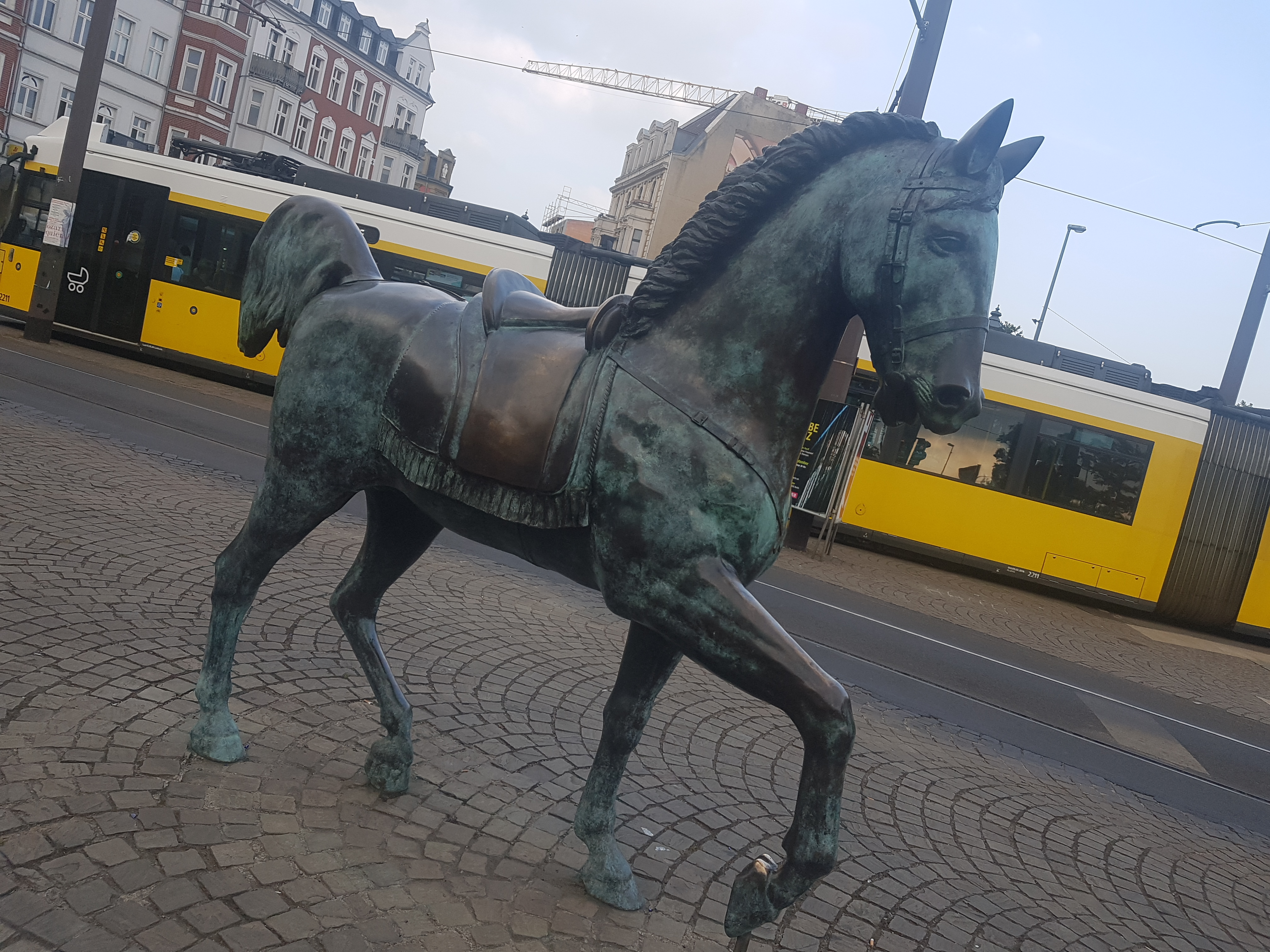 One of two riderless horses in the inges idee sculpture “Wild Horses” in the old city of Berlin-Köpenick (photo by Anita Malhotra, Sept. 7, 2018)