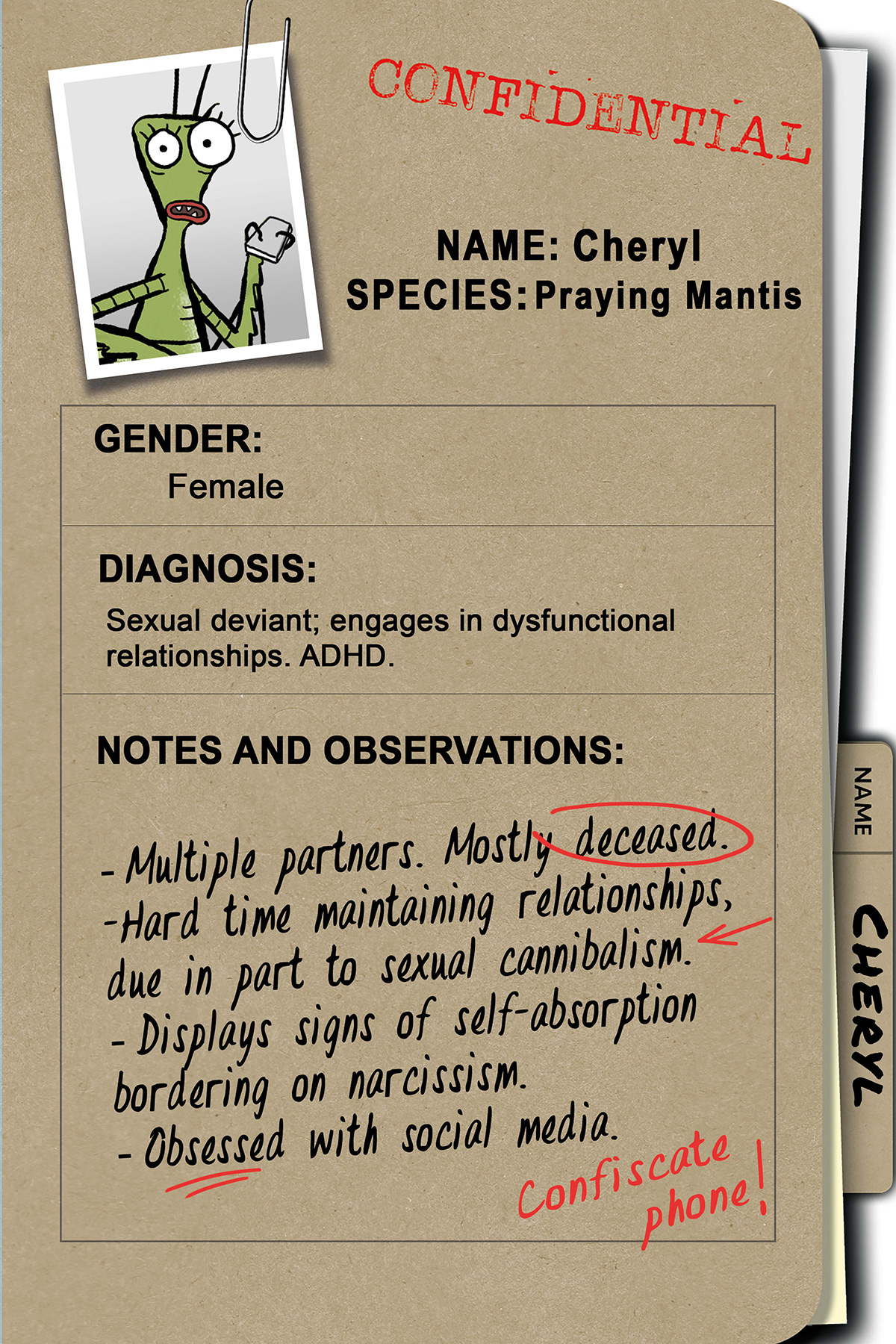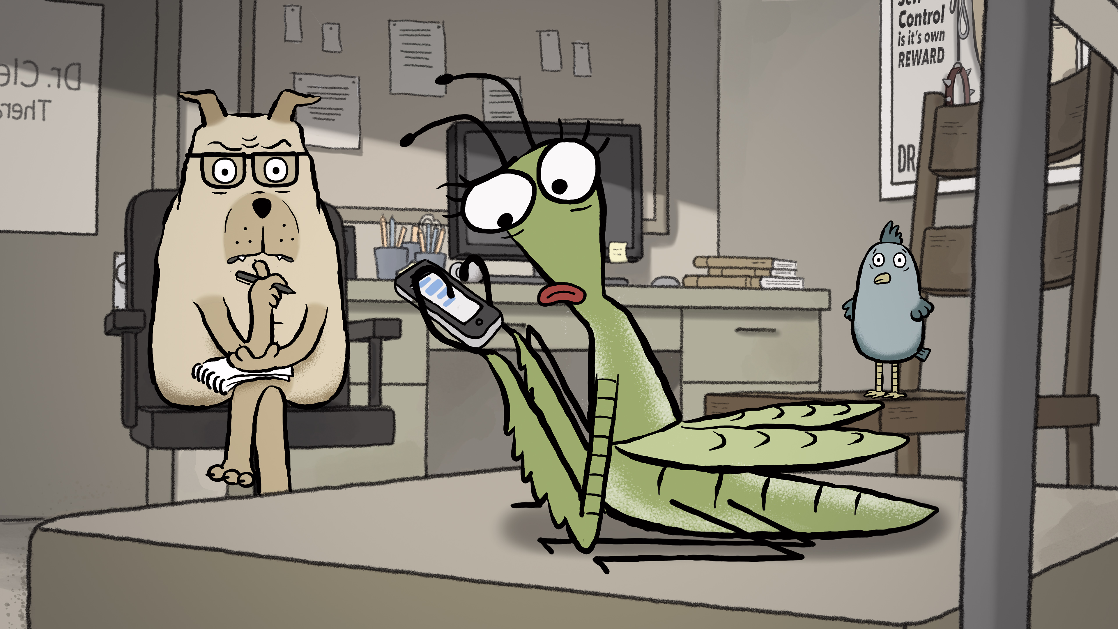 Cheryl the praying mantis showing signs of ADHD during her group therapy session in Alison Snowden and David Fine’s “Animal Behaviour” (still courtesy of the National Film Board of Canada)