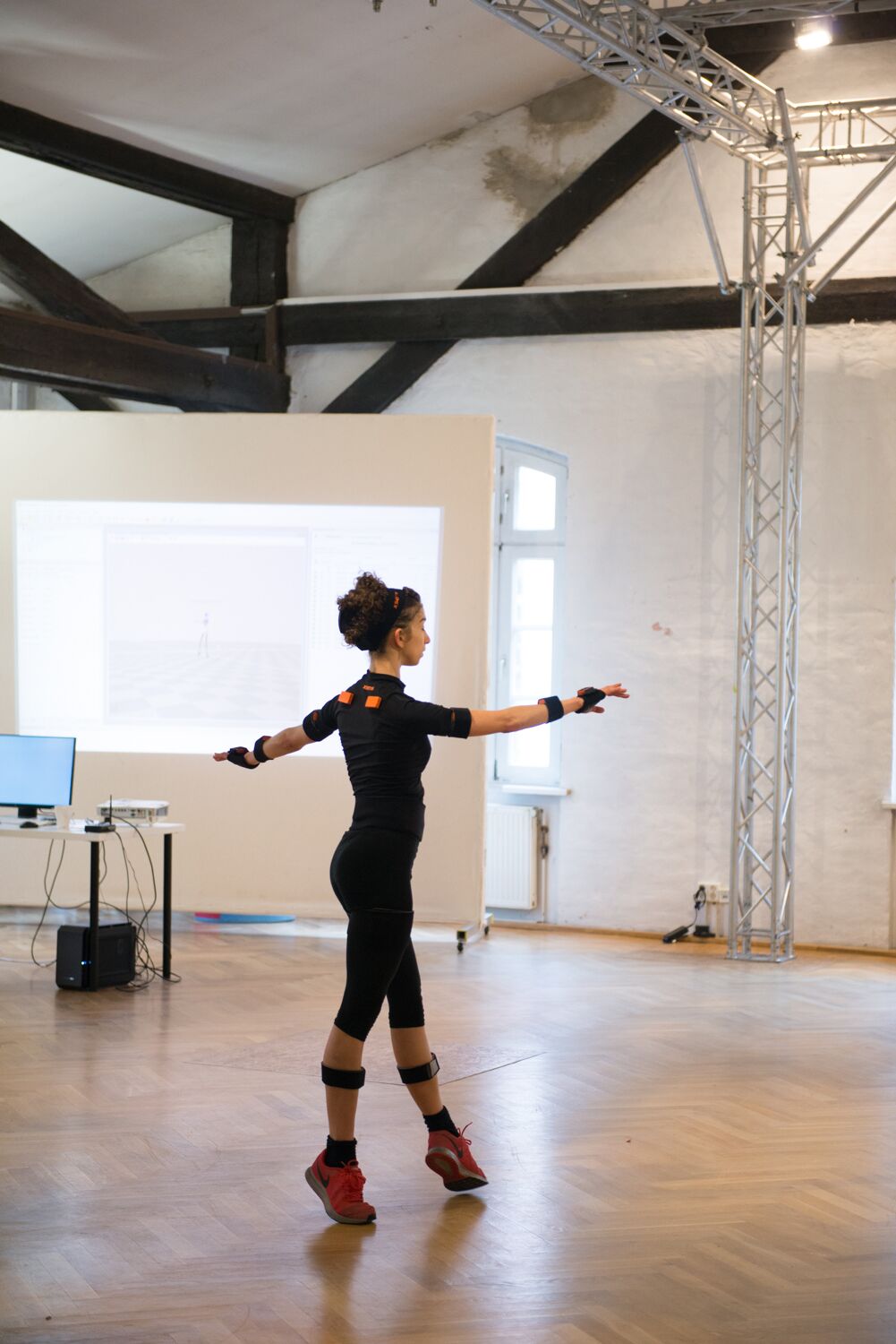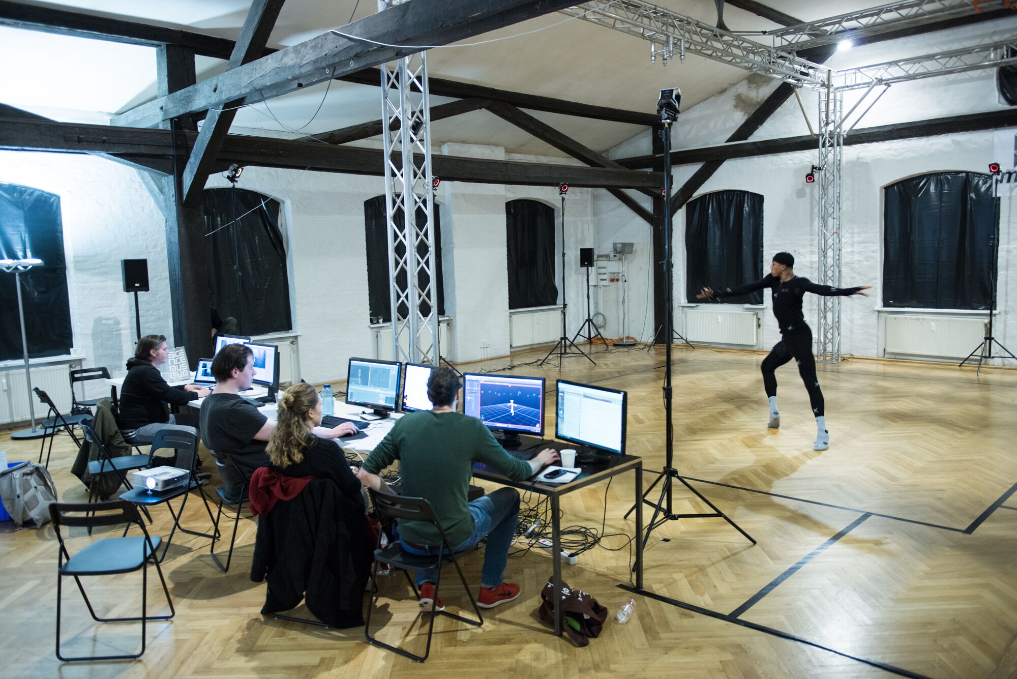 A dancer in the motion capture studio for “Das Totale Tanz Theater” (© Interactive Media Foundation)