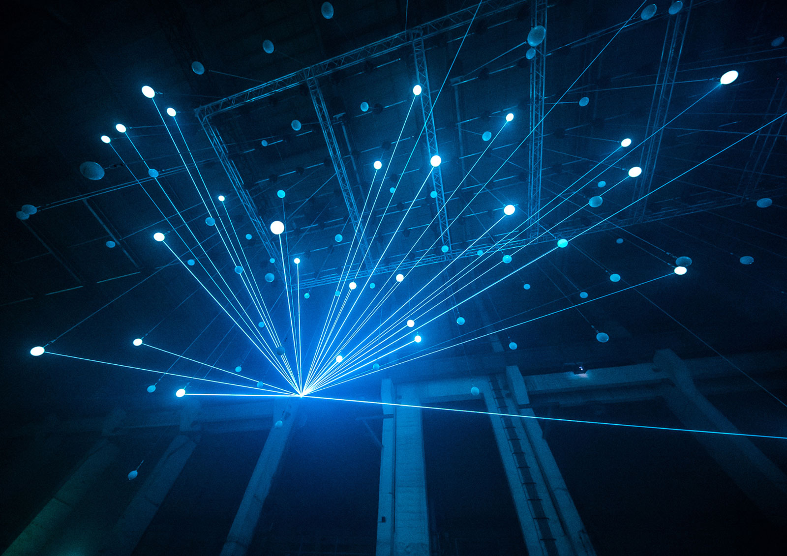 CB: DEEP WEB is a large-scale audio-visual installation. It’s 175 15-centimetre diameter balls. They’re filled with water and each of them is attached to a motor – a winch – on the ceiling so we can move them and animate them in patterns. And then we have an arrangement of 12 high-power lasers around this, and the lasers are basically tracking those balls.