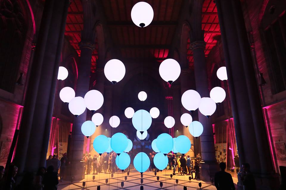 ELECTRIC MOONS by Christopher Bauder, at the St. Maria Church in Stuttgart in 2018 (photo by WHITEvoid)