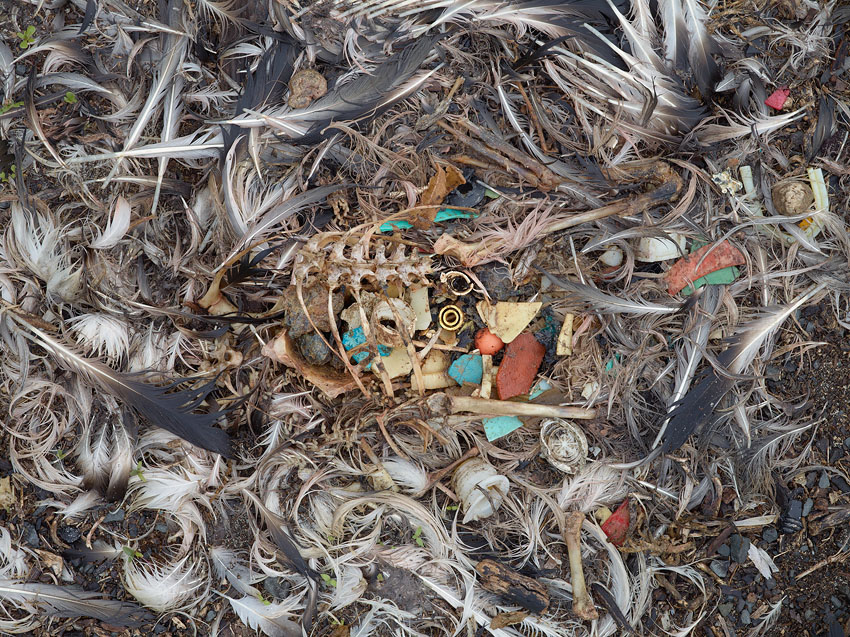 A photo from Chris Jordan’s series “Midway: Message from the Gyre” depicting a baby albatross on Midway Atoll that has died from ingesting too much plastic (photo courtesy of Chris Jordan)