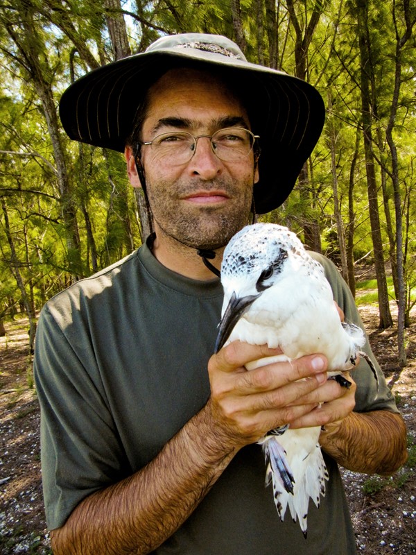 Chris Jordan at Midway Atoll holding a red-tailed tropicbird with a broken wing (courtesy of the Midway Project)
